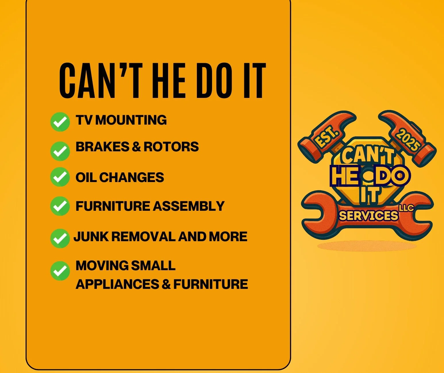 Can't He Do It was founded in 2025 in the heart of Jacksonville, Florida, with a simple mission: to make life easier, one task at a time. What started as a one-man operation has quickly grown into a trusted name for homeowners and businesses looking for reliable, affordable, and high-quality services.